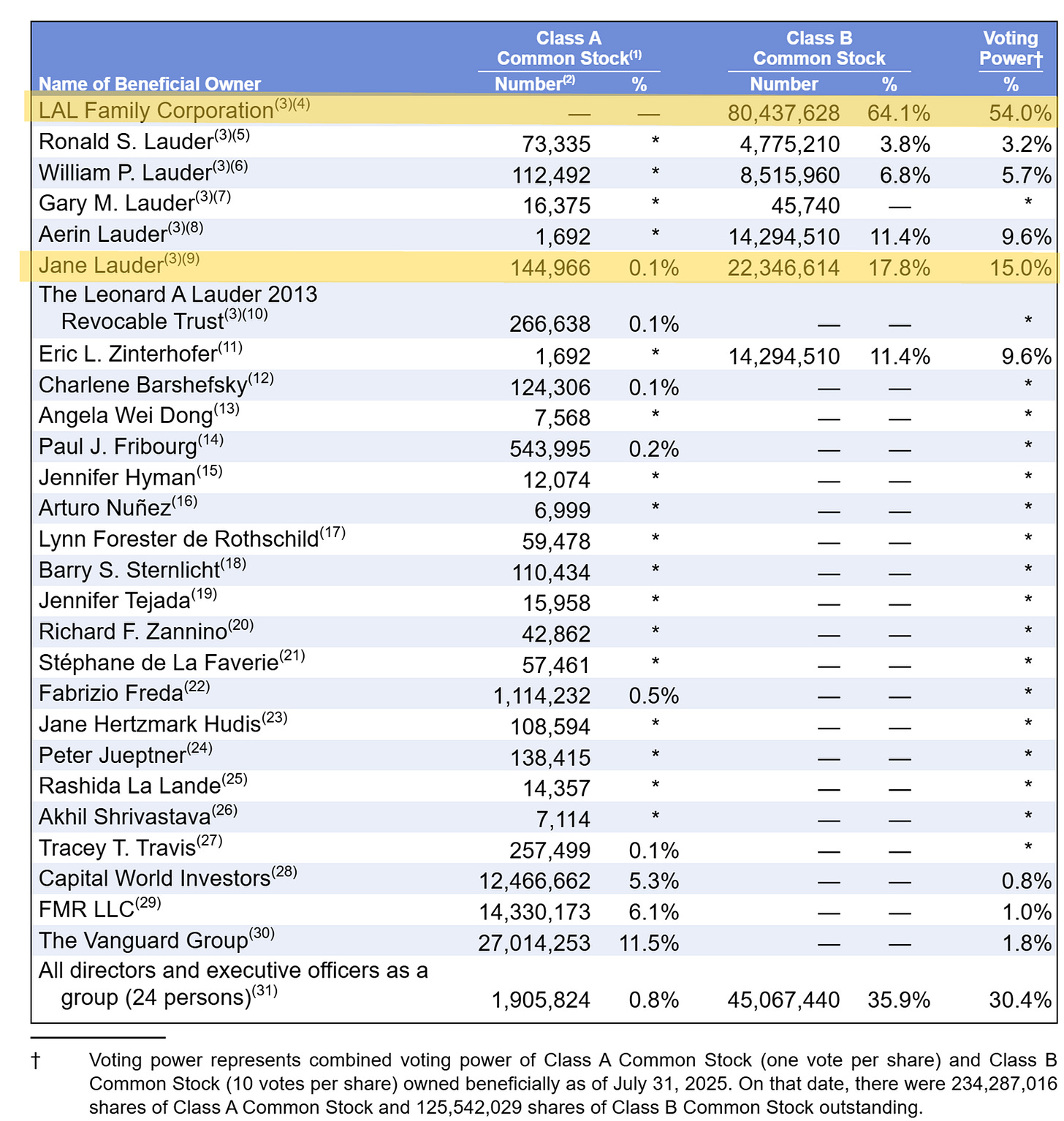 Jane Lauder’s net worth is estimated at +$2.7 billion. Most recently, Estée Lauder reported that she owned preferential shares (as a Lauder family member) directly giving her 17% voting power and 64% as a member of various family trusts. Thus, Warsh’s wife has the largest single voting stake in a Fortune 500 company.